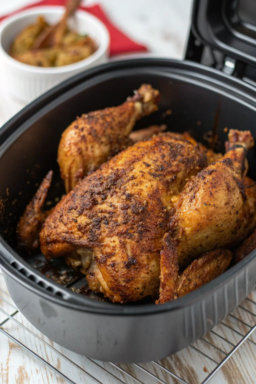 7. Air fry for 10 minutes, then flip the chicken and cook for an additional 10 minutes, or until the internal temperature reaches 165°F (74°C).