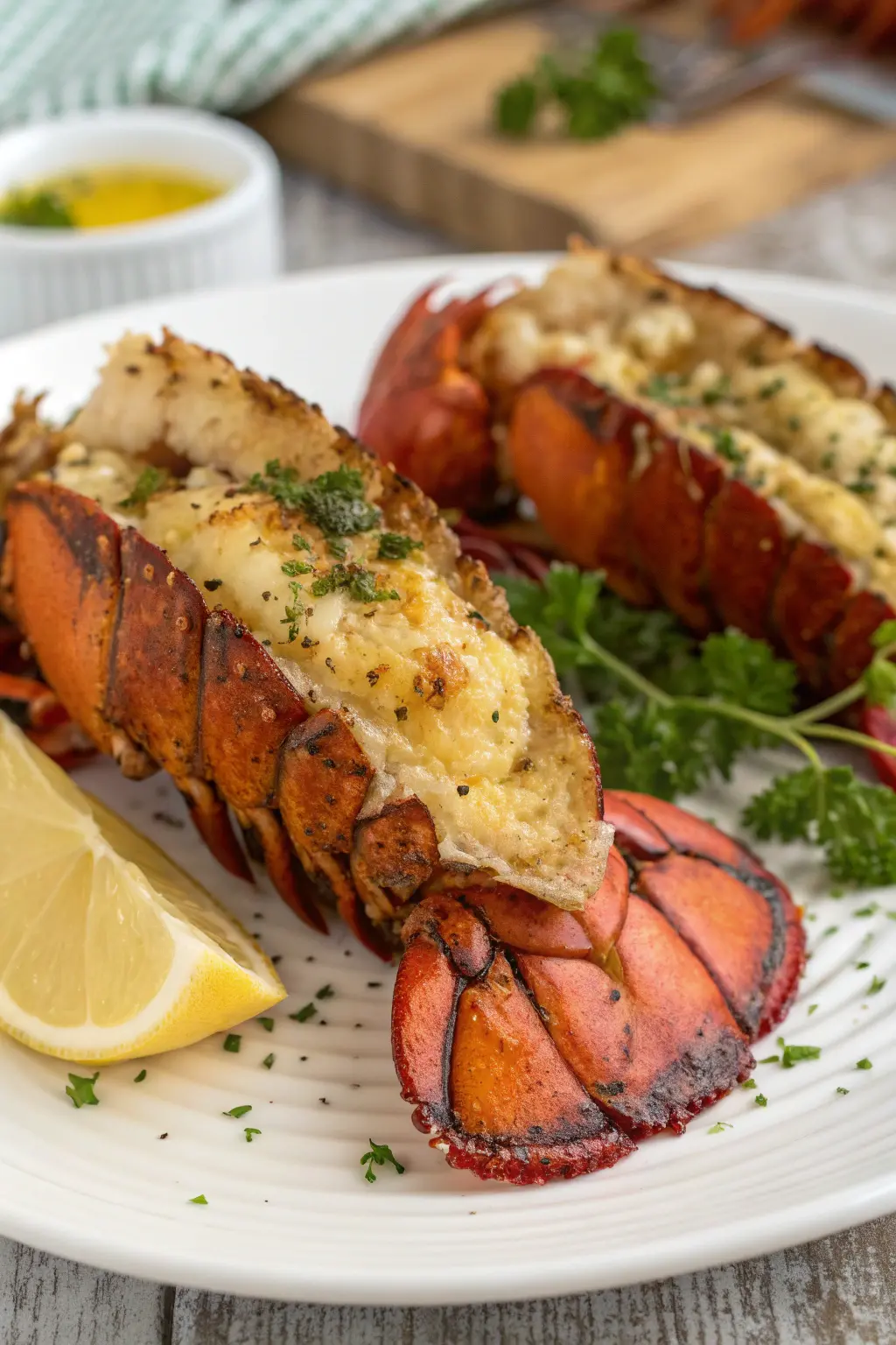- Using kitchen scissors, cut the top shell of each lobster tail lengthwise to expose the meat. Gently pull the meat out slightly and lay it on top of the shell.