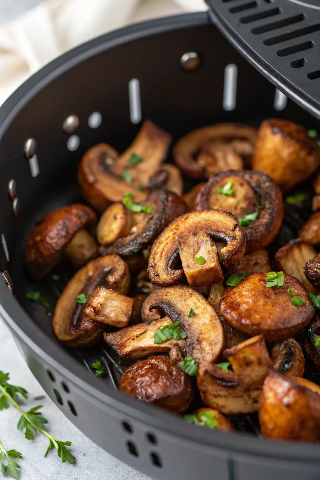 - Place the seasoned mushrooms in the air fryer basket in a single layer.