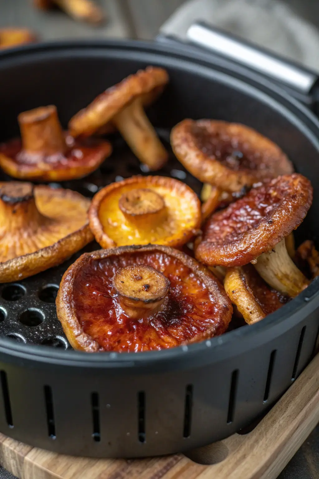 - Place the coated reishi mushrooms in the air fryer basket in a single layer.